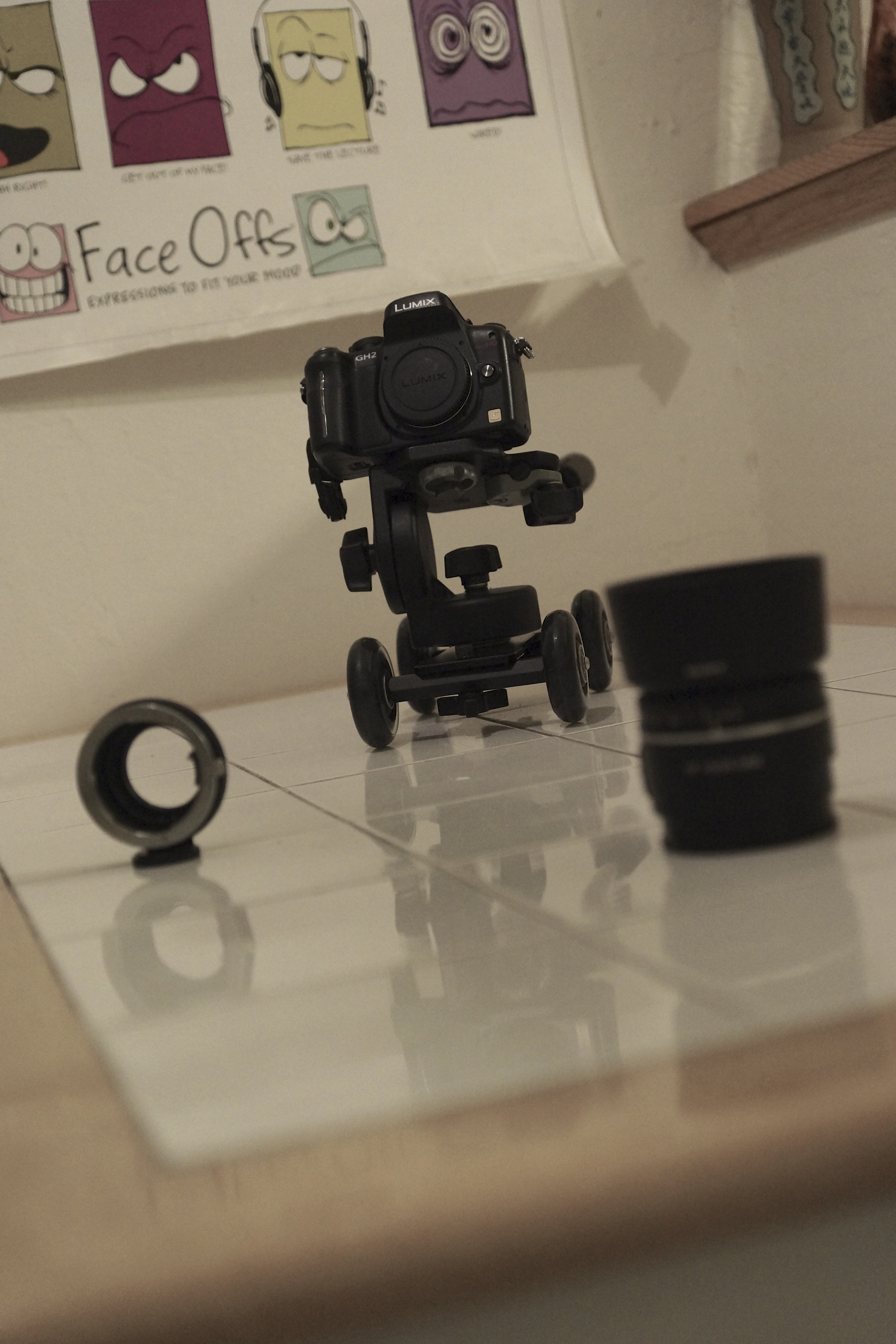 These tips stem from the fact that I have shaky hands. It started out with the intention to, for myself, pixel peep the Apocalypse Now 444 GOP 12-15 Soft hack on the GH2. I slapped on the Fotodiox Alpha A mount adapter, which I can recommend (has an aperture ring built in), and fixed a 35mm 1.8 lens. I paired this setup with the Pico Skater Dolly, found a flat wooden plank and shot different parts of the house.